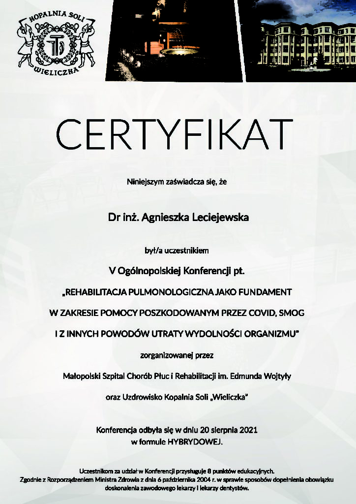 Covid-19 wyzwanie dla medyków i wielkie wyzwanie dla dietetyków. Także temu poświęcona była ogólnopolska konferencja REHABILITACJA PULMONOLOGICZNA JAKO FUNDAMENT W ZAKRESIE POMOCY POSZKODOWANYM PRZEZ COVID, SMOG I Z INNYCH POWODÓW UTRATY WYDOLNOŚCI ORGANIZMU”, która odbyła się w dniu 20.08.2021 r. . Wygłosiłam tam wykład na temat: Podstawowe zasady zdrowego odżywiania w okresie rekonwalescencji dla poszkodowanych przez Covid, smog oraz inne przyczyny utraty wydolności organizmu.