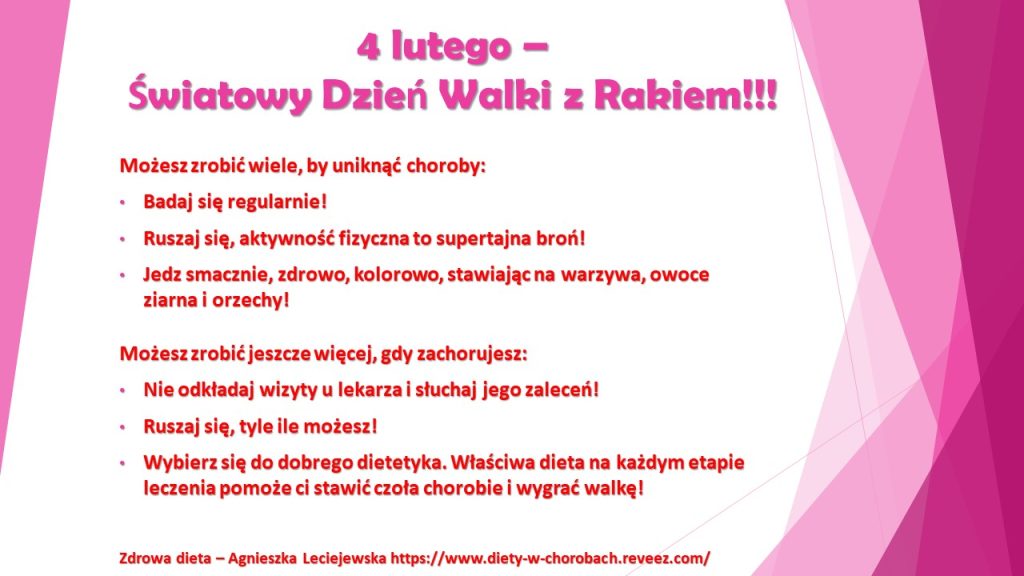 10 milionów – tyle osób rocznie umiera z powodu raka. Choć mamy coraz bardziej zaawansowane metody leczenia, nadal w wielu przypadkach nie potrafimy wygrać walki z chorobą. Warto więc dołożyć wszelkich starań, by przechylić szalę zwycięztwa na stronię zdrowia. Chorobie można skutecznie zapobiegać. Wcześnie wykryta daje szanse na dłuższe życie, w wielu przypadkach na całkowite wyleczenie. Zaś odpowiednia dieta pozwala nie tylko uniknąć kłopotów, ale w razie zachorowania wzmacnia organizm i zwiększa skuteczność terapii onkologicznej. Onkolodzy alarmują: wielu chorych umiera nie z powodu samej choroby, a z…. głodu!!! Dlatego właściwa dieta jest jednym z podsatawowych elementów terapii i to na każdym etapie leczenia, począwszy od pierwszej wizyty u onkologa. Warto o tym pamiętać!